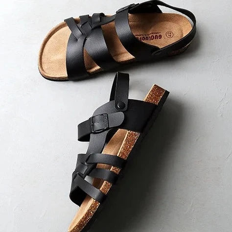 Deze elegante sandalen bieden onovertroffen comfort dankzij het suède voetbed en hebben een kurk-latex binnenzool voor persoonlijke ondersteuning. Het ontwerp heeft een bovenwerk van synthetisch leer, terwijl de rubberen buitenzool zorgt voor lichtheid en flexibiliteit.