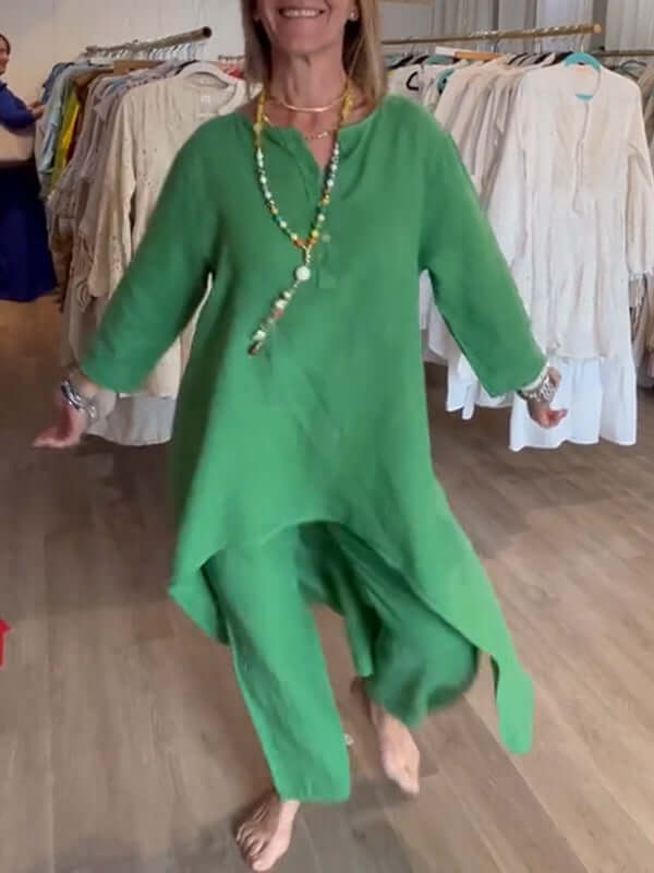 Ontdek onze collectie casual linnen pakken voor dames en vind je perfecte stijl voor elke gelegenheid. Onze pakken zijn gemaakt van zacht en luchtig linnen en bieden een comfortabele pasvorm en een ontspannen, elegante esthetiek die geschikt is voor zowel alledaagse avonturen als speciale gelegenheden. Dankzij het veelzijdige ontwerp kun je deze pakken gemakkelijk aan je eigen stijl aanpassen. Ons linnen casual pak is ook perfect voor stranddagen of picknicks in het park, dankzij het lichtgewicht en koele materiaal dat je de hele dag comfortabel houdt.