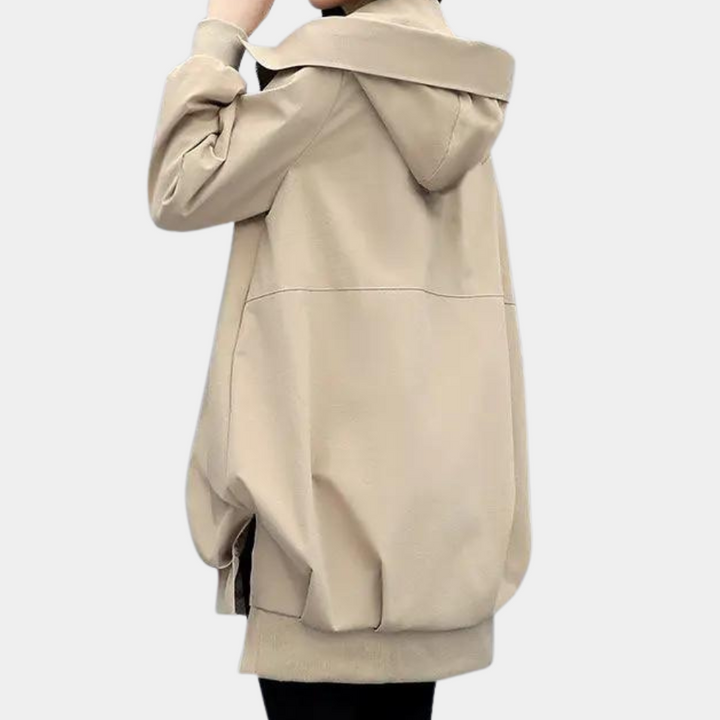 ✔️ Opstaande kraag met capuchon – Biedt extra bescherming tegen wind en kou.