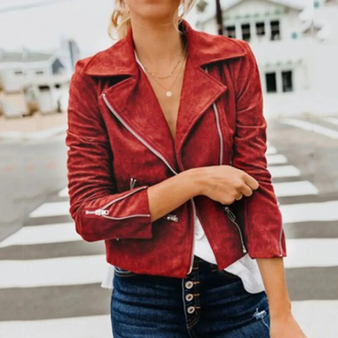 Getailleerd rood leren motorjack voor dames