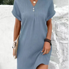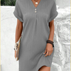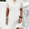 Deze casual jurk met V-hals en korte mouwen combineert comfort met een tijdloos ontwerp, perfect voor dagelijkse activiteiten of een ontspannen dagje uit.