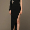 Maak een grootse entree met de Maeve avondjurk met hoge split, ontworpen om hoofden te doen draaien bij elk evenement. Met een gedurfde hoge split en een asymmetrische schouder, is deze jurk versierd met opvallende embellishments die een vleugje sprankeling toevoegen.