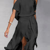 De jurk is de belichaming van moeiteloze elegantie. Met een asymmetrisch ontwerp en een off-shoulder halslijn straalt deze jurk verfijning uit. De vloeiende stof beweegt sierlijk bij elke stap, terwijl de gedrapeerde taille de vrouwelijke vormen accentueert. Perfect voor zowel zomerse evenementen als chique avondjes uit.