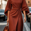 De midi jurk straalt tijdloze elegantie uit met een moderne twist. De wijde mouwen en de subtiele tailleband geven deze jurk een luxueuze uitstraling, perfect voor een chique avond of een stijlvolle daglook.