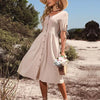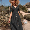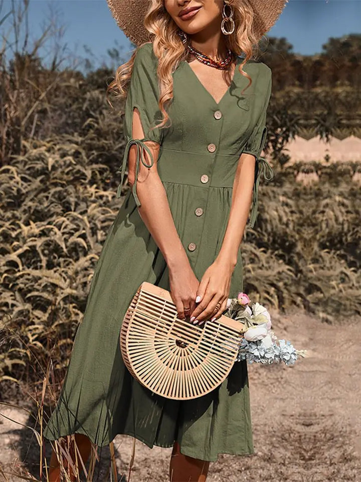 • Chique en tijdloos ontwerp: Met zijn elegante V-halslijn en speelse knopen aan de voorkant straalt onze jurk verfijning en charme uit, waardoor hij perfect is voor elke gelegenheid, van stranduitstapjes tot brunchafspraken.
