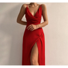 Deze elegante zomerjurk is een must-have voor warme dagen. Met een flatterende V-hals, verstelbare spaghettibandjes en een subtiele split biedt deze jurk zowel comfort als stijl.