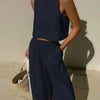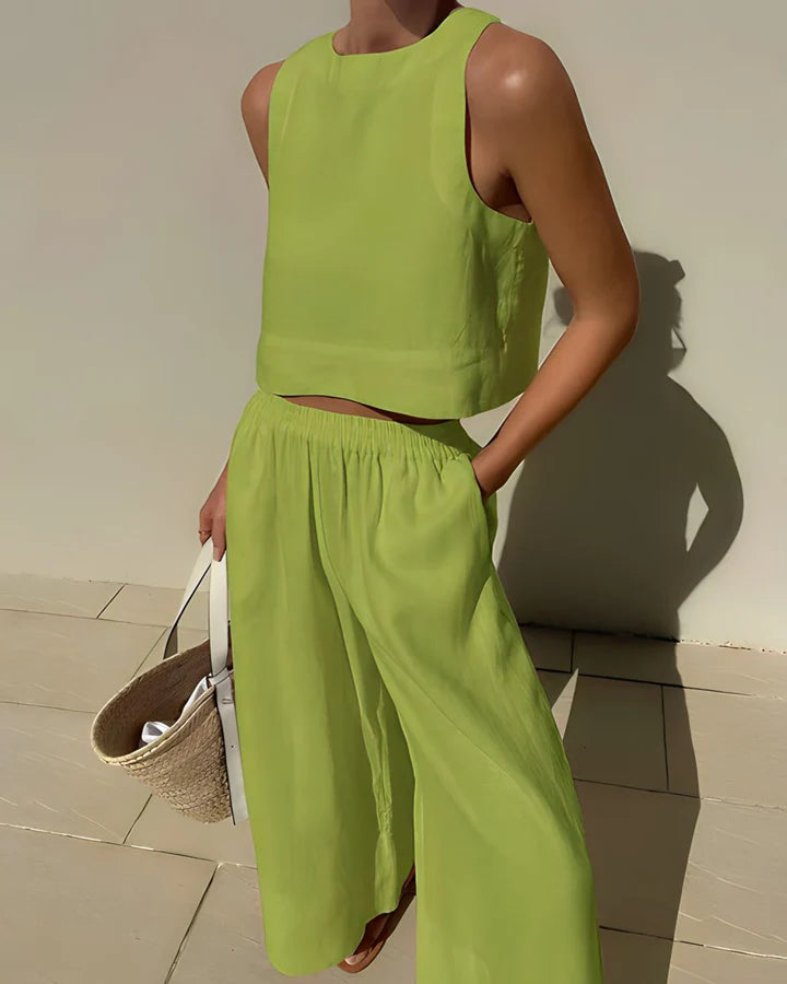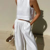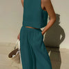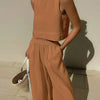 Het setje heeft een stijlvolle mouwloze top die perfect past bij bijpassende broek. De broek heeft een comfortabele wijde pasvorm met een elastische taille voor optimaal comfort en flexibiliteit. Beide kledingstukken zijn gemaakt van een lichtgewicht stof die ademt en een luxe gevoel van comfort geeft.